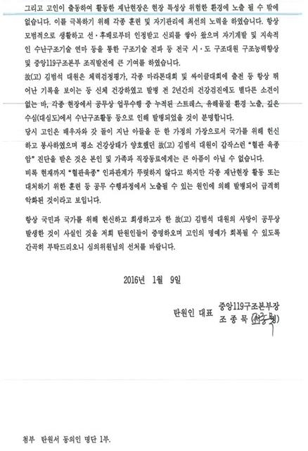 재심의가 한창 진행 중이던 올해 1월에는 그가 근무하던 ‘중앙119구조본부’가 이례적으로 공단에 탄원서를 제출했다. 중앙본부 차원에서 탄원서를 제출한 것은 김 소방관 사례가 처음이다. 중앙본부 측은 구조대원으로 국민과 국가를 위해 헌신하고 봉사한 고인의 명예를 회복하려 한다고 밝혔다. 또 김 소방관의 경우 평소 신체가 건강했고 2년 전 건강검진에서도 문제가 없었기 때문에 업무상 스트레스와 화재 현장의 유해물질이 질병의 원인이었을 것이 ‘분명’하다고 호소했다. 중앙119구조본부는 1994년 성수대교 붕괴, 1995년 삼풍백화점 붕괴 이후 국가적 특수재난에 대응하기 위해 만든 조직이다.