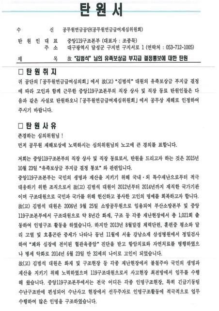 재심의가 한창 진행 중이던 올해 1월에는 그가 근무하던 ‘중앙119구조본부’가 이례적으로 공단에 탄원서를 제출했다. 중앙본부 차원에서 탄원서를 제출한 것은 김 소방관 사례가 처음이다. 중앙본부 측은 구조대원으로 국민과 국가를 위해 헌신하고 봉사한 고인의 명예를 회복하려 한다고 밝혔다. 또 김 소방관의 경우 평소 신체가 건강했고 2년 전 건강검진에서도 문제가 없었기 때문에 업무상 스트레스와 화재 현장의 유해물질이 질병의 원인이었을 것이 ‘분명’하다고 호소했다. 중앙119구조본부는 1994년 성수대교 붕괴, 1995년 삼풍백화점 붕괴 이후 국가적 특수재난에 대응하기 위해 만든 조직이다.
