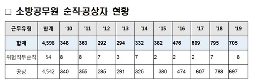 2010∼2019년 순직한 소방공무원은 모두 54명이었다. 구조(19명)와 화재진압(14명), 구급(8명) 등의 순으로 많았다. 공상자는 지난 10년 간 총 4542명이었는데 구급(1027명), 화재진압(988명), 구조(393명), 생활안전(70명), 훈련 등 기타(2064명) 순으로 많이 다쳤다.
