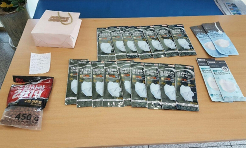 5일 서울 강북경찰서 삼양파출소에 한 민원인이 기부한 보건용 마스크 20장과 편지 등이 놓여 있다. 연합뉴스