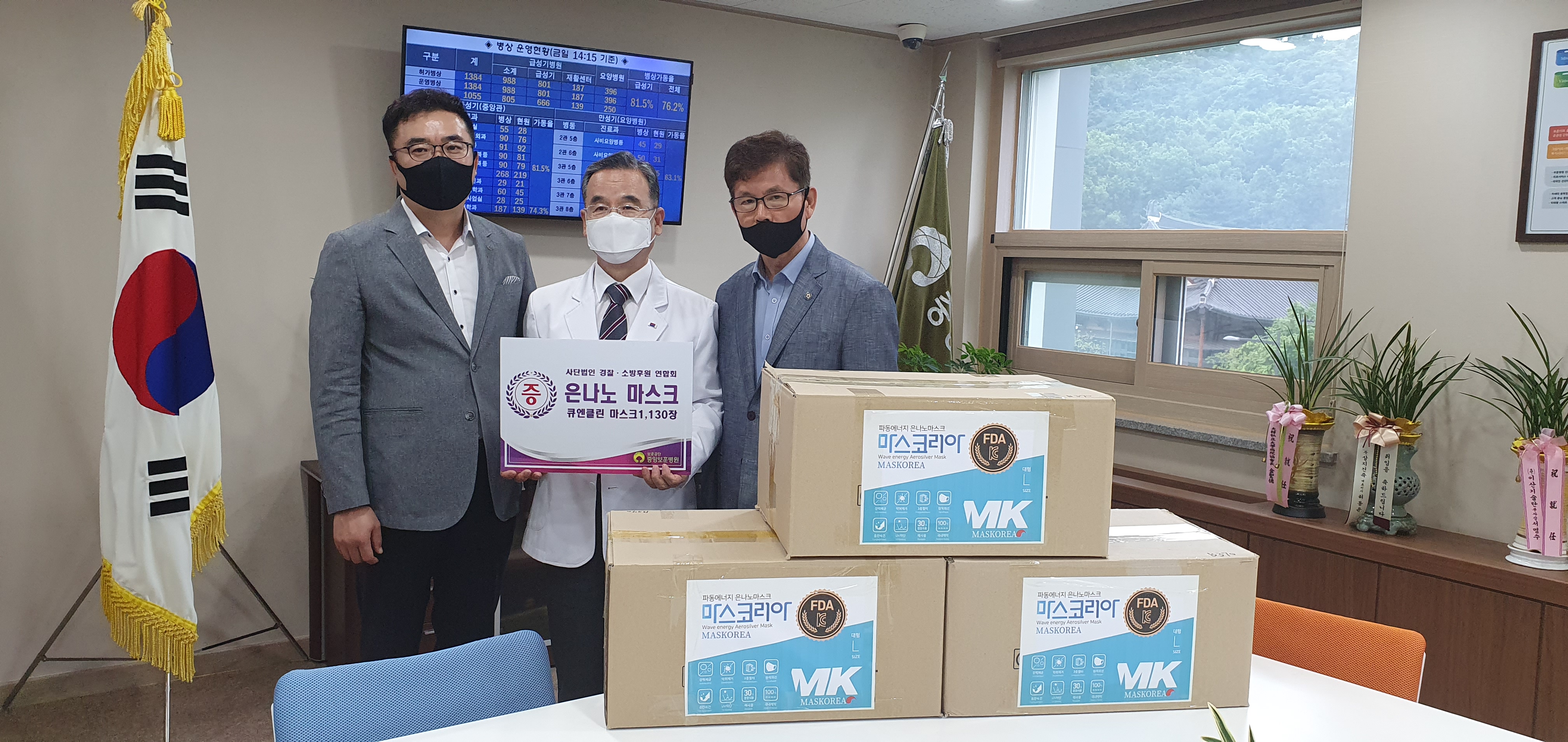 MK(마스코리아)마스크 기증자 에프지아크스의 서대엽 대표와 논의한 끝에 보훈병원도 찾아가 파동에너지 은나노 마스크를 전달하게 되었다