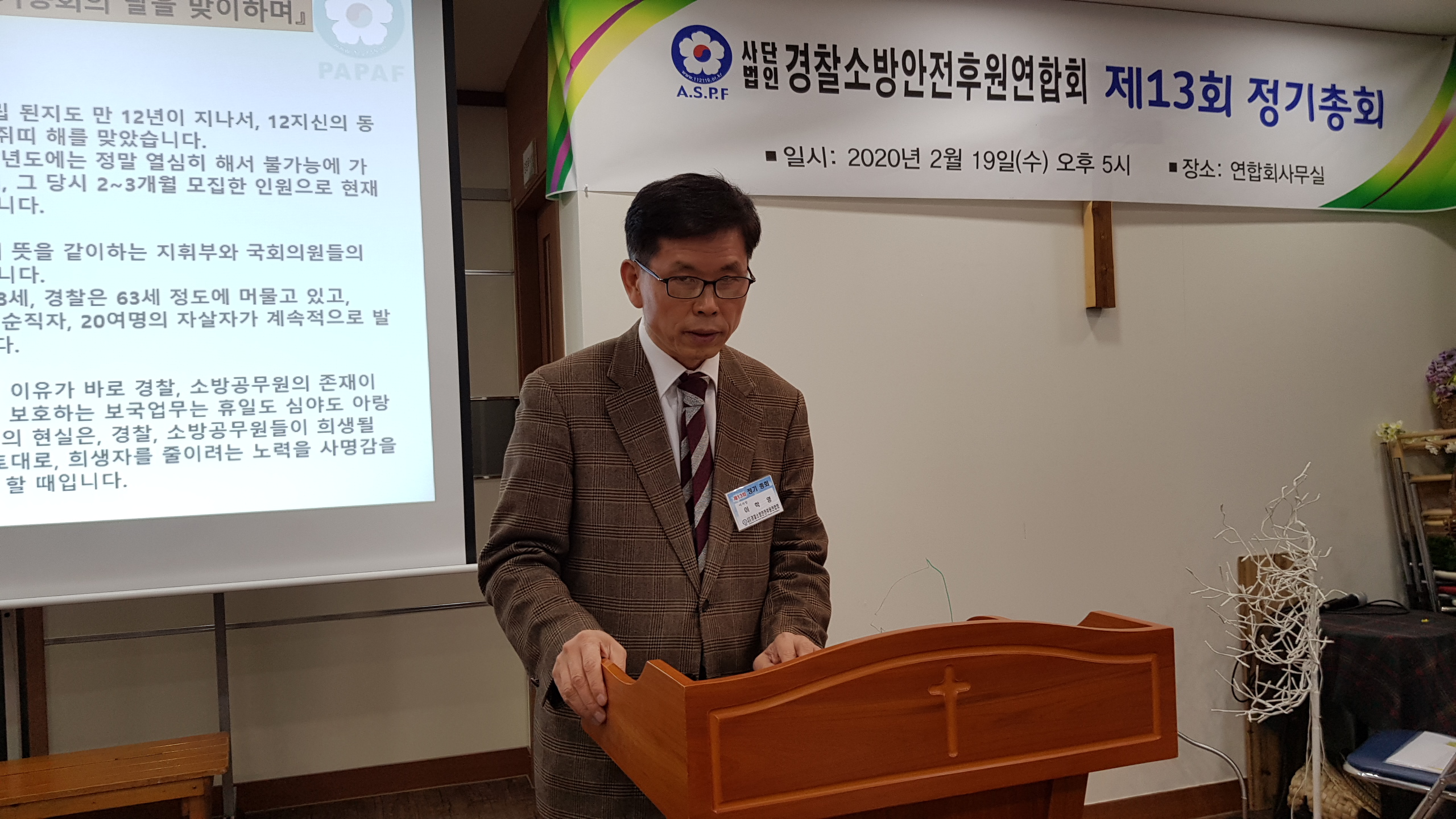 또한 우리 단체가 설립되어 활동하면서 뜻을 같이하는 지휘부와 국회의원들의 도움으로 많은 부분, 개선되었다고 봅니다. 그러나 아직도 평균 수명이 소방은 59, 경찰은 64세 정도에 머물고 있고 매년 2천 여 명의 공상자와 20여명의 순직자, 20여명의 자살자가 계속적으로 발생하고 있는 것이 현실입니다.